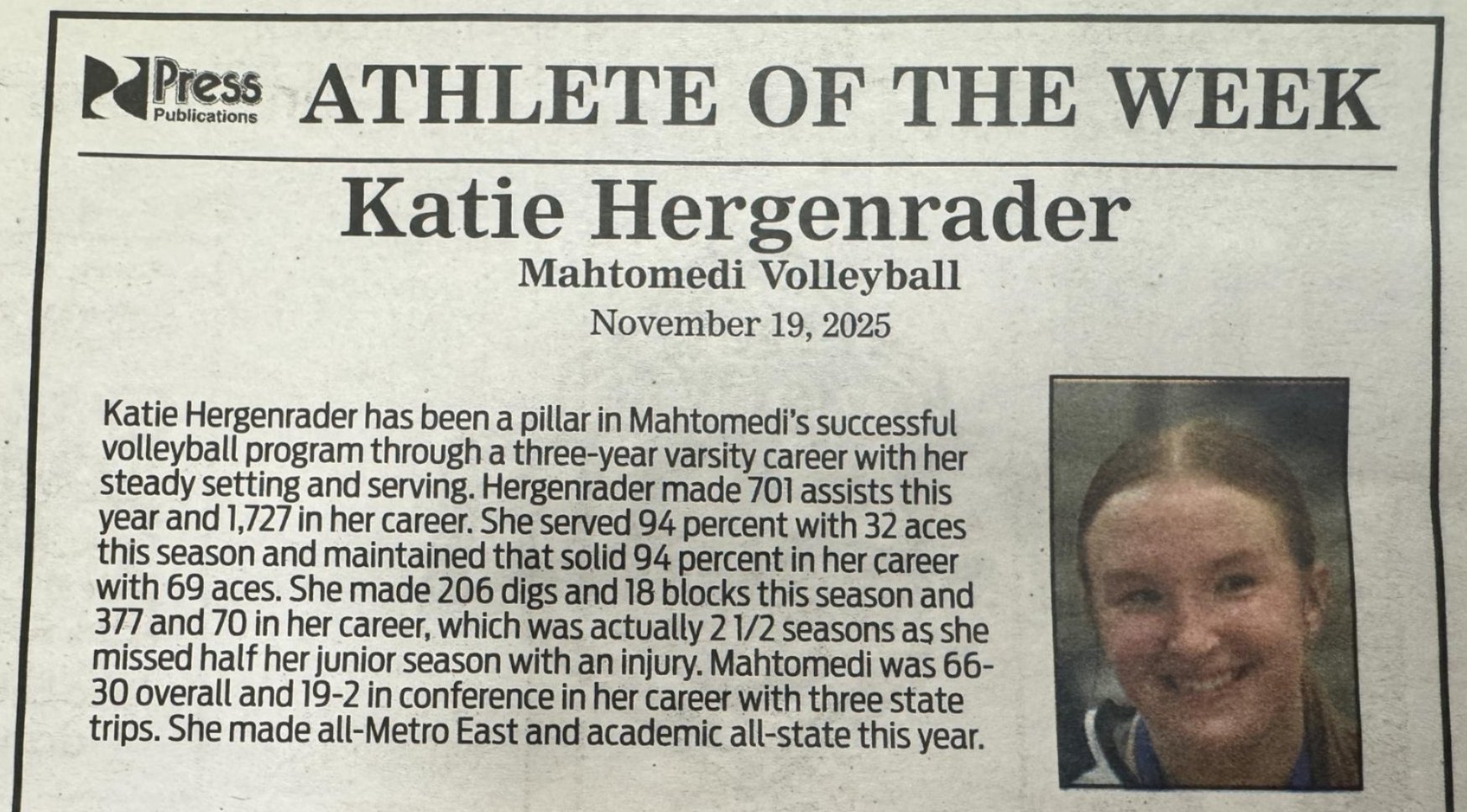 Congratulations to Katie Hergenrader (Class of 2026) on being named this week's Athlete of the Week by the White Bear Press. |