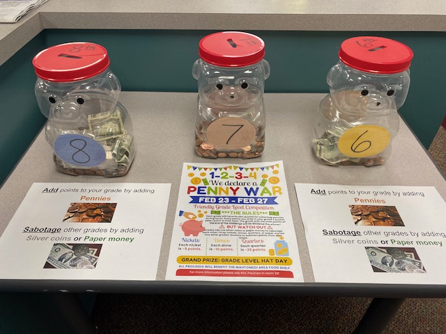 As a part of Spirit Week, the Student Council is sponsoring a Penny War this week to earn funds for the White Bear Area Food Shelf. Grades earn positive points for each penny in their jar but they can also sabotage other grades with silver coins or paper money, which are negative points. The grade with the most points at the end of the week will win a Hat Day!