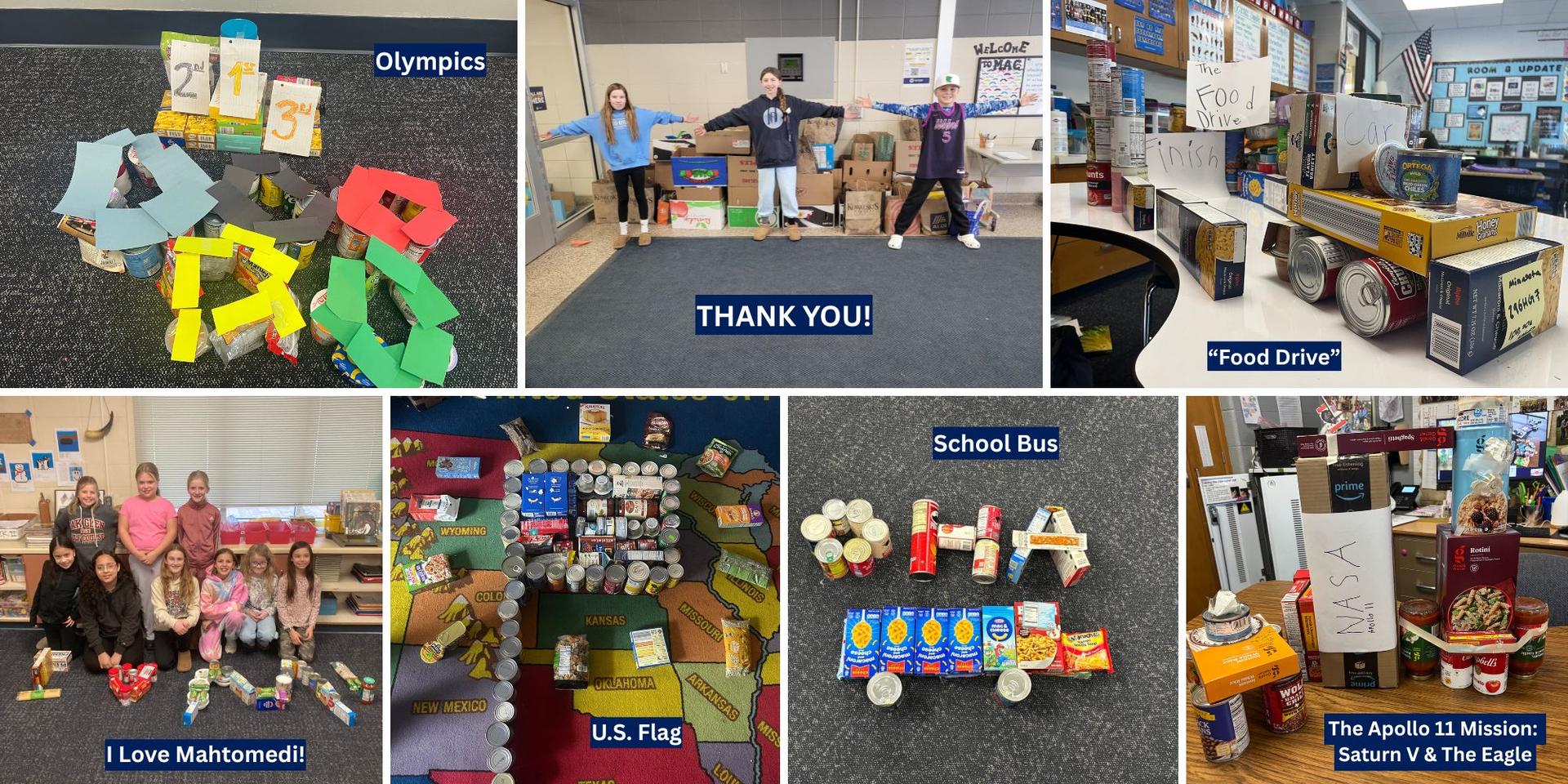 | Thank you for donating items for our food drive. 1,121 lbs of food collected! Check out the creative sculptures at OHA.